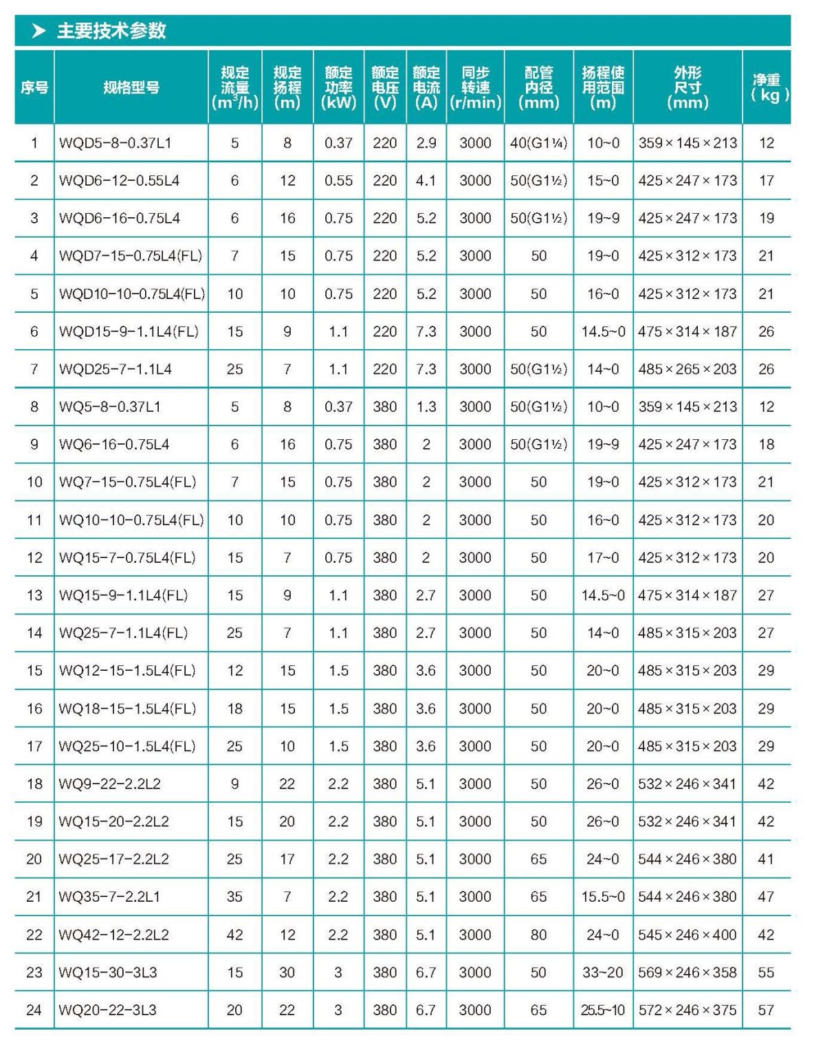 WQ(D)-L 型污水污物潛水電泵 ( 以下簡(jiǎn)稱電泵 ),電泵由水泵、密封 和電動(dòng)機(jī)三部分組成,電動(dòng)機(jī)位于電泵上部,為單相或三相異步電動(dòng)機(jī); 水泵位于電泵下部,為流道式葉輪 - 蝸殼結(jié)構(gòu);水泵與電機(jī)之間采用 二個(gè)獨(dú)立機(jī)械密封作動(dòng)密封,各固定止口密封處采用 "O" 形耐油橡膠 密封圈作靜密封,確保電泵的可靠性。電泵轉(zhuǎn)子軸采用摩擦焊接軸材 質(zhì),確保軸有更可靠的機(jī)械強(qiáng)度,可有效提高軸的耐磨性和耐腐蝕性, 同時(shí)也便于葉輪的維修拆卸。